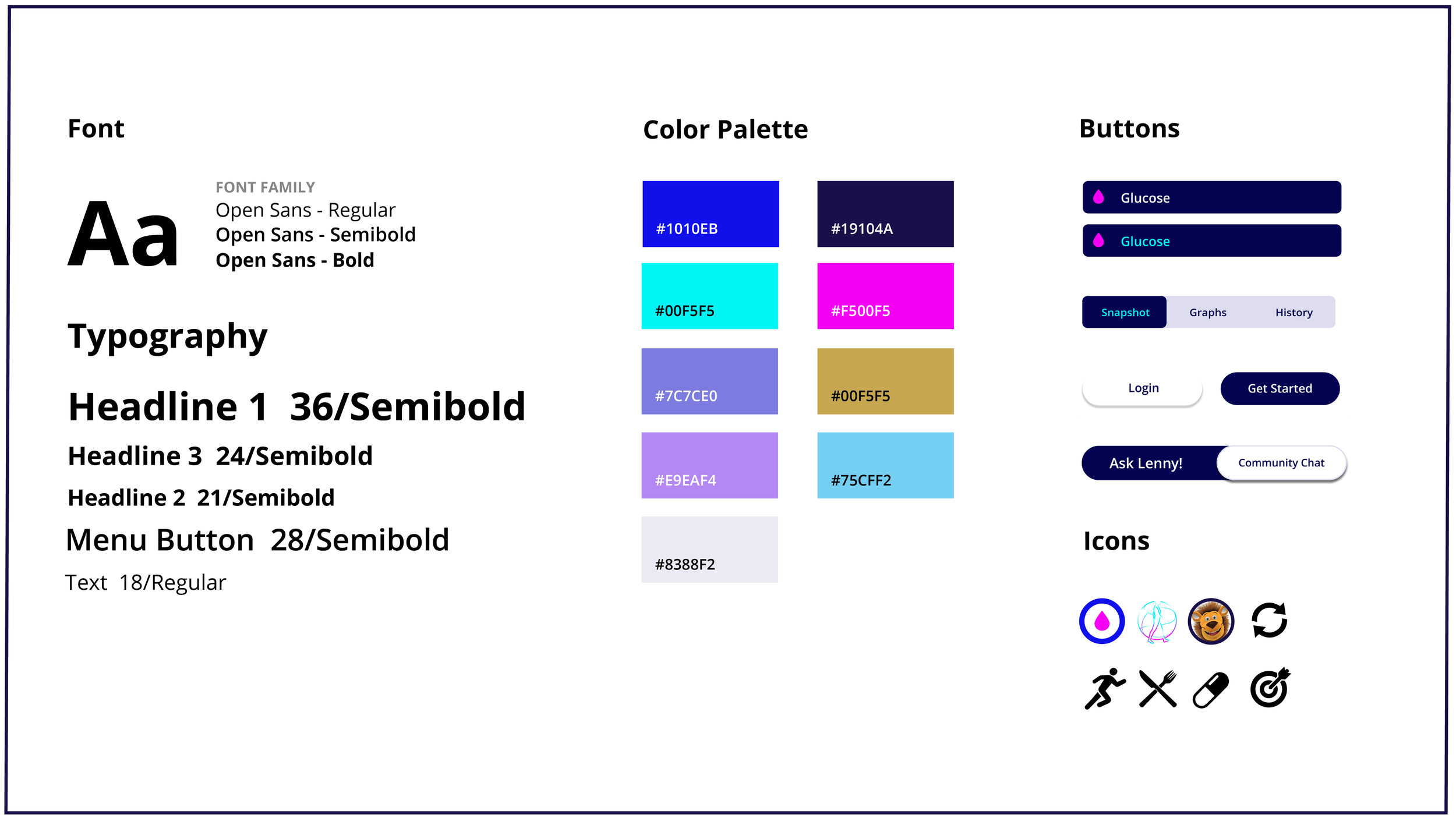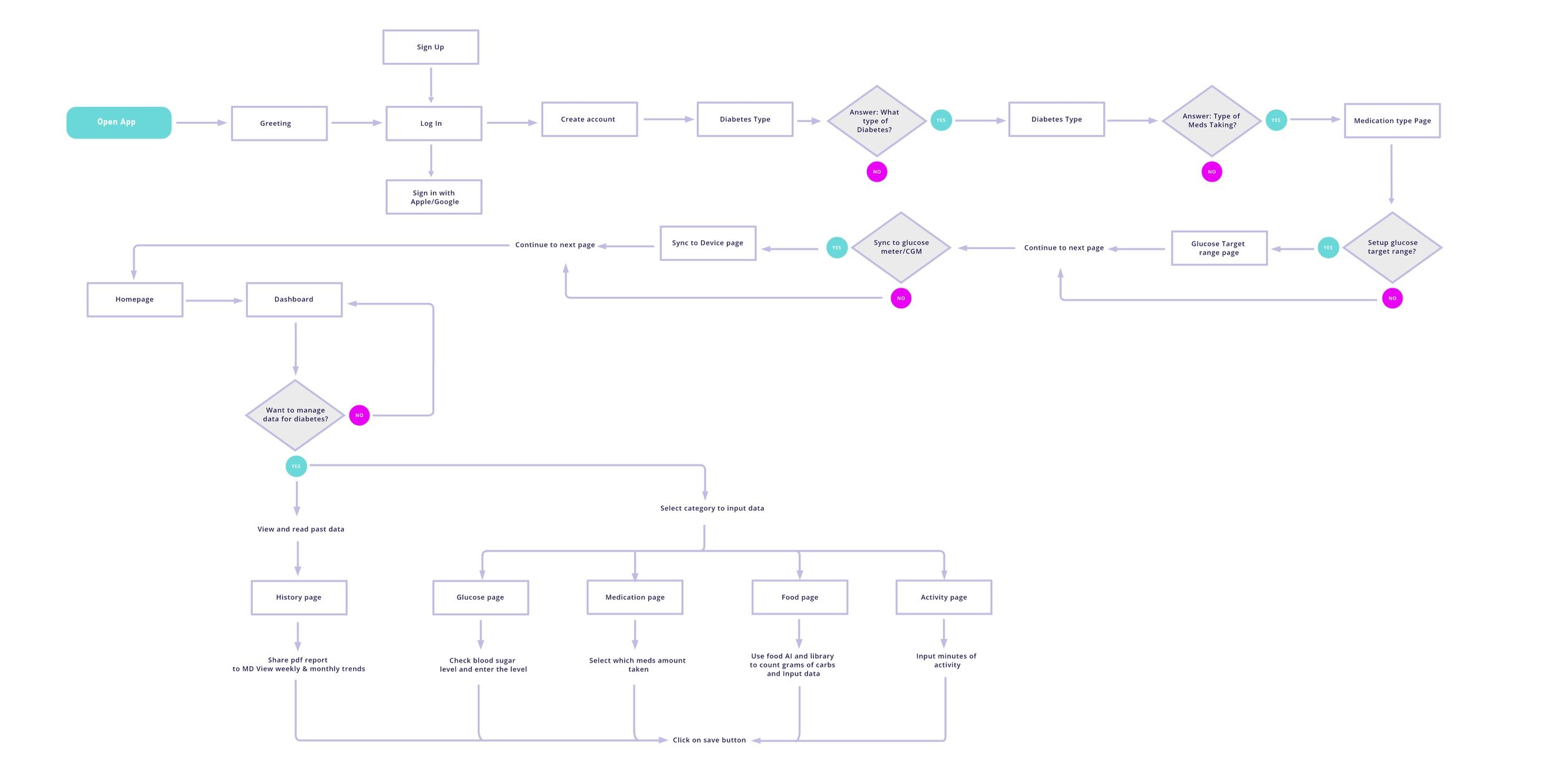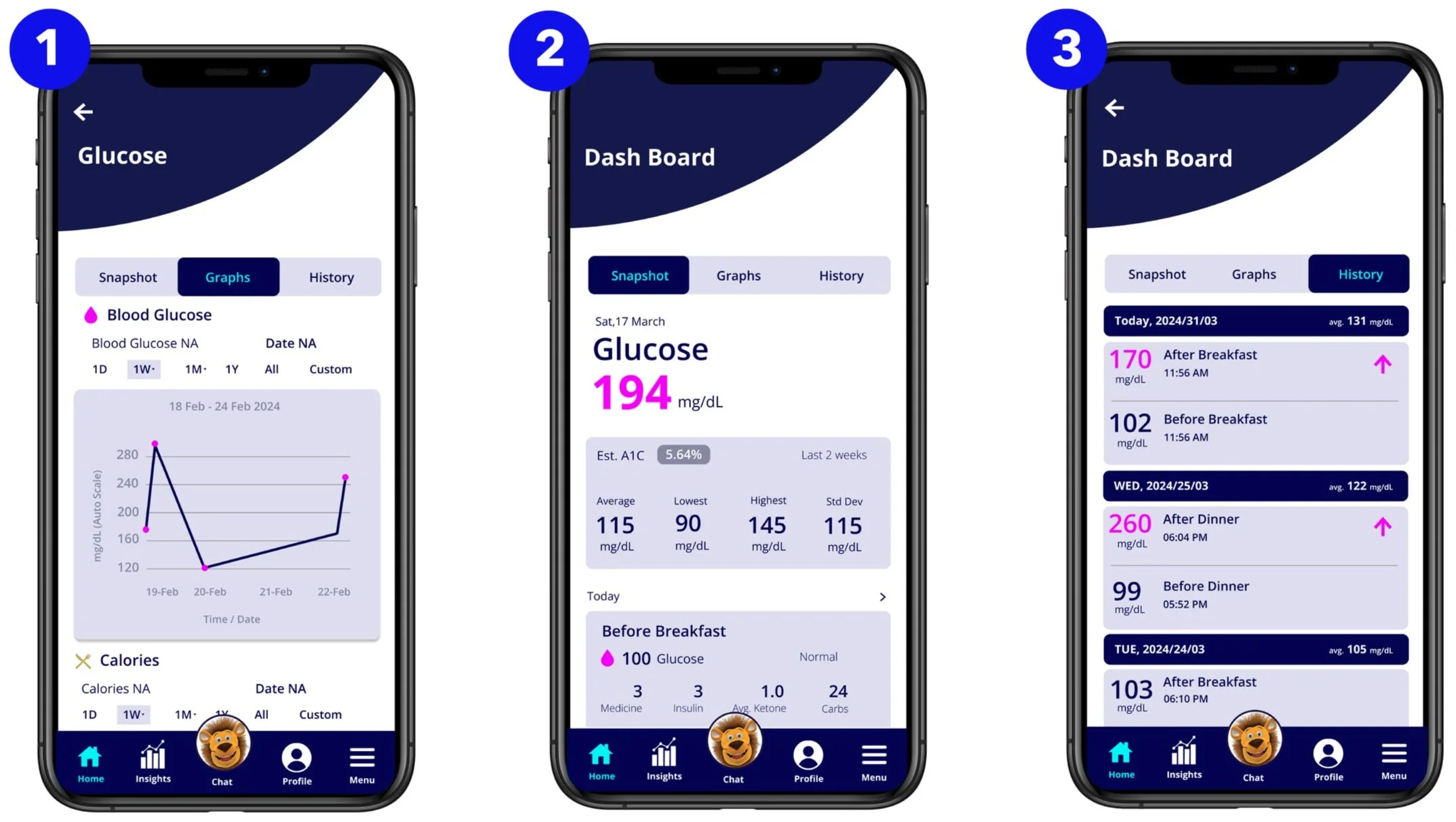 My top priority while creating this app redesign is to provide improved legibility and easy navigation. In the top menu section, I prioritized core features into 3 categories; Snapshot, Graphs, and History, for user to keep better track of their daily Diabetes regimen.